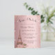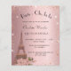 Um convite moderno, na moda e glamouroso para uma Quinceañera, festa de aniversário 15, tema parisiense. Um fundo metálico cor-de-rosa pincelado com faíscas brilhantes rosa douradas e a torre Eiffel com algumas flores. O nome é escrito com um moderno estilo escrito à mão. Personalize e adicione os detalhes da sua festa.