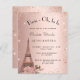 Um convite moderno, na moda e glamouroso para uma Quinceañera, festa de aniversário 15, tema parisiense. Um fundo metálico rosa dourado falso com brilhos falsos e a torre Eiffel com algumas flores. O nome é escrito com um moderno estilo escrito à mão. Personalize e adicione os detalhes da sua festa.