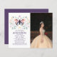Orçamento Quinceañera Moderna Borboleta Rosa Púrpura Foto Convite Floral Apresenta uma borboleta rosa simples, mas elegante e roxa entre flores bonito com a sua informação de Convite Quinceañera abaixo. Personalize editando o texto nas caixas de texto fornecidas e adicionando sua foto favorita. Projetado para você por ©Evco Studio www.zazzle.com/store/evcostudio