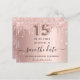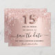 Uma garota e moda Salve o cartão de data para uma Quinceañera, 15 festa de aniversário. Rosa dourado esmaecido fundo metálico decorado com ouro rosa, dourado e cinzas vítreas e poeira. Personalize e adicione uma data e um nome/texto. O texto: Salvar a Data é gravado com um script de estilo com letra de tendência grande com alternâncias. Número 15 com uma fonte no estilo do balão.