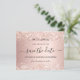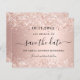 A Save the Date Card for a Quinceañera, 15 festa de aniversário. Um fundo metálico rosa dourado com aspecto decorado com poeira falsa brilhante. Personalize e adicione uma data e nome/idade. O texto: Salvar a Data é gravado com um script de estilo com letra de tendência grande com alternâncias.