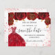 Uma garota e moda Salve o cartão de data para uma Quinceañera, 15 festa de aniversário. Rosas vermelhas decoradas em fundo branco, faíscas brilhantes vermelhas e um vestido vermelho. Personalize e adicione uma data e nome/idade. O texto: Salvar a Data é gravado com um script de estilo com letra de tendência grande.