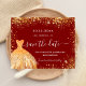 Uma garota e moda Salve o cartão de data para uma Quinceañera, 15 festa de aniversário. Um fundo na moda vermelho decorado com faíscas de brilho fino e um vestido de cor ouro. Personalize e adicione uma data e nome/idade. O texto: Salvar a Data é gravado com um script de estilo com letra de tendência grande.