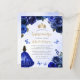 Este adorável convite da quinceañera mostra uma fronteira de rosas azuis reais em um fundo azul de aquarela. Uma tiara dourada, uma menina de cabelos escuros em um vestido real de princesa azul e pequenas borboletas azuis decoram o texto. A palavra "Quinceañera" e o nome do convidado de honra aparecem num elegante guião dourado, com o texto remanescente na fonte serif cinza.