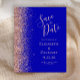 A borda esquerda deste elegante casamento moderno salve o cartão de data apresenta um rosa dourado falso borda brilhante. O texto personalizável combina manuscrito pálido de cor azul-pincelada, manuscrito e fontes itálicas em um fundo azul real. O verso apresenta um design real azul e rosa dourado correspondente.