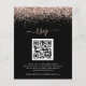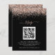Uma alternativa de orçamento com custo-benefício em um tamanho menor de 4,5 x 5,6” semi-brilho com 110lbs de peso, que tem uma espessura semelhante à de um cartão postal (no entanto, não é adequado para uso como cartão postal). POR FAVOR, OBSERVE que há UM convite por folha. Orçamento Rosa Dourado Glitter Código QR script RSVP Online Casamento Preto. Uma borda de brilho falso no topo em ambos os lados com um script elegante com floreios para o cabeçalho. Troque o código QR pela página de resposta do seu site de casamento para uma opção de resposta alternativa conveniente para seus convidados. Para criar um código QR, procure online "gerar um código QR"