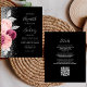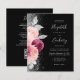 A borda esquerda deste convite de casamento moderno e elegante apresenta um buquê floral em tons de burgundy e rosa desmaiado, aparado com folha de alumínio falsa prateada e folhagem falsa cintilante e polvilhado com purpurina falsa prateada. O texto personalizável combina fontes script manuscrita cinza prateada, copperplate e itálico em um fundo preto. O verso fornece espaço para detalhes do casamento em um fundo preto sólido, juntamente com um código QR que os convidados podem digitalizar para visitar seu site e confirmar presença.