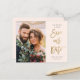 Um anúncio moderno e limpo de salvar a data com foto, apresentando uma mensagem de salvar a data em caligrafia. Clique no botão de editar para personalizar este design.
