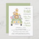 Um convite para o chá de um bebê casal, amigável em orçamento, com ilustração de animais do zoológico bebê (leão, elefante, zebra, macaco e girafa) amontoado em um veículo safari e "Está prestes a se tornar selvagem" em tipografia divertida, e "Chá de fraldas" e os nomes de mãe e pai na coordenação da escrita verde do exército. Você pode personalizar facilmente os detalhes do chá, mudar o texto "É um menino!" no veículo, e adicionar a data do chá na placa de licença, ou deixar o vazio.