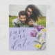 Este anúncio elegante "salve a data" é perfeito para pôr em marcha os planos de casamento. Apresenta um modelo de fotografia e uma grande tipografia em roxo escuro sobre fundo lilático pálido. Complementar sua foto é um delicado grupo de flores selvagens em branco roxo e amarelo. Personalize com seus próprios detalhes. Consulte outros itens nesta coleção exclusiva e original.