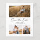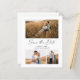 Orçamento Script 3 Foto Casamento Salvar a Data cartão. O verso inclui detalhes adicionais. Clique no botão editar para personalizar este design com suas fotos e detalhes do casamento.