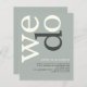 Um valor para o alternativo do ORÇAMENTO em tamanho menor de 4,5 x 5,6" de semirbrilho de 110 lbs, que é de espessura semelhante a um cartão postal (no entanto, não é adequado para uso como cartão postal). POR FAVOR, OBSERVE QUE HÁ UM convite por folha. BUDGET Simple Sage Ivory Text Convite de casamento. Um design tipográfico moderno com Nós fazemos em grande tipografia em Ivory com eles "d" em cinzas, rotacionado e à esquerda sobre um fundo de verde-sábio claro. As cores de fundo e texto podem ser alteradas se você desejar, por meio de Personalizar mais.