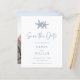 Este casamento orçamentário moderno e mínimo na praia salve o cartão de data com um fundo branco com texto azul empoeirado, dois estrelas-do-mar no topo, e caligrafia de escrita manual, com um modelo fotográfico no verso.
