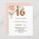 Um convite elegante para uma doce 16, 16 festa de aniversário. Um fundo branco chic. Decorados com um rosa de ouro e rosa cor-de-rosa-esbranquiçada, folhas de eucalipto florais, verdes, galhos, verde e borras de ouro. Personalize e o nome e os detalhes da festa. Letras pretas e ouros. O nome é escrito com um moderno estilo escrito à mão. O número 16 é escrito com uma fonte no estilo do balão de ouro. Traseira: cor de fundo rosa dourada.