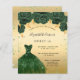 Um convite moderno, na moda e glamouroso para uma doce festa de aniversário 16, 16. Um fundo de ouro falso com poeira brilhante verde, um vestido verde esmeralda e rosas verdes, florais. O nome é escrito com um moderno estilo escrito à mão. Personalize e adicione os detalhes da sua festa.