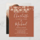Com luzes bonito de cordas e seus nomes de estilo de foto e assinatura, este convite de casamento elegante do terracotta pode ser personalizado com suas informações em caracteres quânticos. Projetado por Thisnotme©
