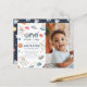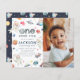 Um pequeno passo! Um belo convite para a festa de aniversário com animais pintados à mão flutuando no espaço. No lado esquerdo da carta, há uma estrutura com um astronauta de gato segurando uma bandeira, um astronauta de cachorro e um astronauta de girafa, aliens em OVNIs, um navio de foguetes, planetas, estrelas e muito mais! No lado direito, há uma foto personalizada de sua escolha. As cartas se revertem a um padrão divertido dos animais espaciais contra um fundo azul escuro. Celebre a primeira viagem do seu pequeno ao redor do sol com este convite de aniversário temático. Largue-me uma mensagem, se quiser que mude o texto para "dois a lua" ou qualquer outro tema etário! Como parte da seleção orçamentária no Zazzle, esta folha não é um tamanho de convite padrão ou qualidade de papel. Se quiser que este design num cartão de convite o encontre na coleção ou utilize o Zazzle Make Machine para o transferir para o produto da sua escolha. Visualize a coleção vinculada nesta página para itens correspondentes ou visite nossa loja para obter mais designs!