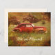 Orçamento vintage rústico campo velho carro vermelho vista lateral em um campo de grama. Nós nos mudamos Frase. Arte legal estilo retrô antigo cartões de mudança de endereço de nova casa. Direitos autorais da imagem Marg Seregelyi Photography.
