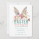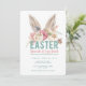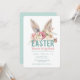 Este divertido convite de Café da Manhã e Caça aos Ovos de Páscoa apresenta orelhas de coelho pintadas à aguarela sobre as palavras "Café da Manhã e Caça aos Ovos de Páscoa". Todos os detalhes do convite estão logo abaixo, num fundo branco brilhante. O verso é uma cor azul aqua coordenada.