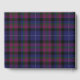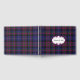 Livro de convidados de xadrez feito no clássico "Regency Blue", ameixa, verde, orgulho preto e branco do modelo de xadrez de tartan da Escócia. Uma área de texto decorativo branco, na frente do livro, tem texto personalizado pronto para personalizar o seu casamento.