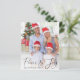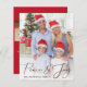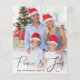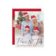 Saudações de três fotos de Natal amigáveis com "Peace & Joy" em um roteiro elegante sobre sua foto na frente. No verso, adicione mais duas fotos e uma saudação personalizada.