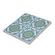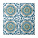 Azulejo decorativo elegante e bonito, em estilo mediterrânico, com formas geométricas em tons azuis, brancos e dourados.