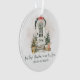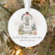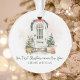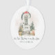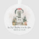 Celebre Novos Começos com este Enfeite Personalizado de "Nosso Primeiro Natal em Nossa Nova Casa" com um gráfico decorativo de porta da frente em aquarela todo decorado para as festas de fim de ano. A porta pode ser personalizada com o ano ou o número do endereço da casa. É personalizável com o nome do casal em uma fonte serifada verde escura - você também pode colocar o ano abaixo do nome do casal. A parte de trás é personalizada com o nome do casal.