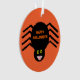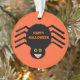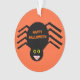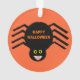 Este adorável ornamento acrílico apresenta uma aranha preta assustadora com oito pernas peludas, olhos amarelos com grandes pupilas pretas e sua boca aberta mostrando suas presas. Há um texto laranja que diz "Feliz Dia das Bruxas" e um fundo laranja correspondente.