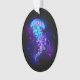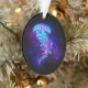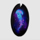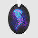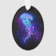 Água-viva grande, azul, desenhada artisticamente, brilhante, brilhante, com longos tentáculos sobre fundo preto com bioluminescência roxa. Água-viva luminosa.