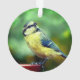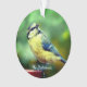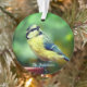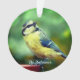 Ornamento personalizado de foto personalizado de pássaro azul de peito amarelo-amarelo. Ideal para todos! Texto sobre um fundo semitransparente apenas no lado frontal!