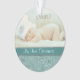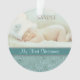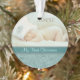 Este ornamento de manutenção de férias apresenta sua própria fotografia de bebê, com uma borda de um elegante rolo floral azul aqua. Uma faixa mais escura mantém o seu texto personalizado; faça-o dizer o que quiser! A parte posterior do ornamento tem o mesmo padrão de espiral floral aqua e faixa de entrelaçamento com texto adicional. Isso faz um belo presente de manutenção para novos pais.