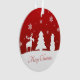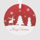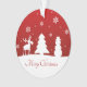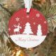Simples ilustração de Natal moderna e minimalista, com silhuetas brancas de renas, árvores, bonecos de neve e flocos de neve, com Feliz Natal a saudar de fundo vermelho.
