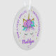 Este ornamento personalizado de unicórnio neta apresenta um design de rosto de unicórnio fofo com flores e estrelas de brilho dourado. Personalize o texto na frente e atrás.