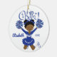 Ornamento bonito do cheerleader do afro-americano do elogio azul & branco. Fácil personalizar com seus nome & data. Visite nossa loja para ver este ornamento em uma grande variedade de cores da escola & de cores do cabelo
