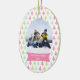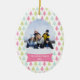 Este ornamento cerâmico dado forma oval do feriado do Natal tem um fundo branco com lotes de árvores de Natal azuis cor-de-rosa, verdes, e macias no fundo. No meio, você pode personalizar a fotografia da família com seus próprios. Abaixo da foto, há uma bandeira cor-de-rosa e branca onde você possa personalizar o nome e o ano de família. Você poderia personalizar o texto para o primeiro Natal de um bebê ou mesmo nosso primeiro Natal para recentemente um casal!