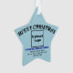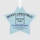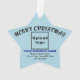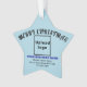 Feliz Natal! Encaminhamento acrílico com textos de saudação de Feliz Natal, logotipo de sua empresa, nome de empresa ou empresa, endereço e número de telefone. Designs são textos azuis e pretos escuros sobre fundo azul claro e em forma estelar. Ornamento para decorar a árvore de Natal em sua loja, compro ou escritório. Ornamento para receber visualmente seus clientes nesta temporada de feriados e anunciar sua empresa ou promover seu nome de marca. Personalize-o e use-o para criar reconhecimento de nome de marca. Verifique a aparência após carregar o logotipo e digitar textos. Se a aparência lhe agrada, você pode colocar seu pedido agora. Se você precisar redimensionar e mover o logotipo e os textos para o ajustado neste ornamento, mude a ferramenta design. Você também pode fazer outras alterações de acordo com sua preferência na ferramenta design, como alterar a cor do ornamento, a cor da fonte e o estilo da fonte. Feliz Natal! Desejo mais vendas para você neste feriado.
