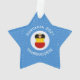 Um anjo vestido na bandeira da Alemanha neste ornamento em forma de estrela para a decoração de Chanucá. Projetado para famílias de múltiplas religiões para celebrar as festas. O anjo da bandeira alemã de Chanucá voa num centro branco de quadrados rabugentos num fundo azul de quadrados rabugentos. Adicione um nome para personalizar. Adicione o ano para personalizar. Ou, adicione seu próprio texto