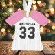 Celebre sua estrela de beisebol com este ornamento personalizado de camisa rosa e branca pinstripe. Perfeito para comemorar uma estação especial, jogador ou equipe. Personalize-o com um nome e número para criar uma manutenção exclusiva.