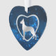 Perfeito para o dono do Dane, este ornamento bonito de Feriado apresenta uma silhueta prateada de Great Dane Dog cercada por um céu azul-estrela da noite. A imagem é colocada dentro de uma forma cardíaca de estrutura falsa de joia, com uma borda azul-luz estelar correspondente. A parte de trás do ornamento tem o mesmo plano de fundo azul, e texto para você personalizar.