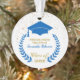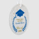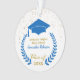 presente de ornamento de graduação para aquele segundo grau especial ou formando universitário com texto frontal e traseiro personalizado. Apresenta a imagem de um boné formando azul e uma coroa de louros impressa em acrílico resistente. Acentuado com confete de ouro falso. Cores vermelhas, pretas e outros bonés também estão disponíveis neste mesmo design