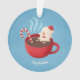 Uns enfeites de natal com ilustração de um boneco de neve bonito que permanece morno mas que derrete um tanto em um copo do cacau quente gostam de marshmallows junto com o bastão de doces. O texto lê a "estada morna" que você pode personalizar com seus próprios cartões de natal do Natal.