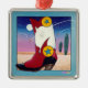 Uma bota de vaqueiro divertida e desenhada em vermelho, branco e preto com sotaque de uma estrela turquesa em um círculo amarelo contra uma paisagem de pôr do sol da noite completa com um par de cactos de saguaro, estrelas em queda e uma lua de cheio.