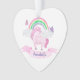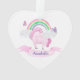 Esse ornamento personalizado apresenta um tema de conto de fadas mágico e encantador. Uma imagem em estilo aquoso de um unicórnio rosa giro é fotografada no centro, em pé na frente de um pequeno arco-íris. Duas borboletas estão fluindo em ambos os lados do arco-íris. Um nome de exemplo é impresso sobre uma faixa que você pode personalizar para incluir seu próprio nome personalizado ou texto.