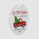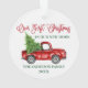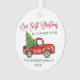 Moderno Diversão de Caligrafia Roteiro Nosso Primeiro Natal em nosso Novo Ornamento Doméstico inclui Watercolor Vintage Red Truck com Árvore de Natal. Texto vermelho e verde.