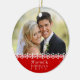 Estes enfeites de natal na moda contudo elegantes fazem uma grande lembrança para recentemente um casal do wed. Caracterizam as palavras "casadas e a feliz" em um fundo da cor sólida e em uns flocos de neve do beira ou os pequenos. Os nomes e o ano podem ser adicionados no verso. Adicione uma imagem do casal feliz e faça-lhe um grande presente de época natalícia!