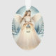 A serene celestial angel stands beneath a snowy archway of evergreens and winter florals, gently cradling a glowing lantern that spills soft golden light across her gown. Behind her, a dusky blue forest of snow-covered trees shimmers with falling flakes and tiny sparks of light, creating a peaceful, storybook atmosphere. Delicate lace details, flowing sleeves, and a halo-like crown of foliage give this winter angel illustration an ethereal, cottagecore charm that feels both nostalgic and on-trend. Soft blue and warm cream tones blend into a dreamy palette that suits spiritual holiday imagery, quiet reflection, and year-round messages of hope. This design is ideal anywhere a touch of calm, light, and heavenly beauty is desired. AI generated artwork.