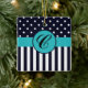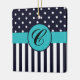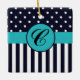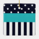 Este design apresenta uma pequena design de bolinhas no topo e um padrão listrado na parte inferior. O ornamento é então acentuado com uma borda turquesa com um logotipo monográfico no centro. Você pode personalizar este produto com sua própria ferramenta inicial com a ferramenta fácil de usar.