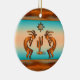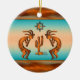 Personalize este Enfeites de natal "Um dos tipos" do sudoeste de Kokopelli! Ele apresenta dois Kokopelli sudoeste em cobre e preto tocando flauta e dançando em volta de um cacto sob o sol em um... Turquoise e um fundo solar laranja! Design De Arte Original Pelo Artista Kerry Miller.