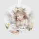 Um belo ornamento memorial da menina anjo para o primeiro Natal sem eles. Um bebê anjo com asas, texto delicado e cores. A parte de trás tem um fundo de papel estrelado