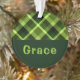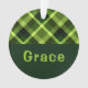 Um ornamento em árvore de Natal acrílico, em círculo monograma, com um belo padrão de xadrez na diagonal, em verde de ervilha. Crie o presente personalizado perfeito clicando no botão "personalizado" para adicionar um nome ou mensagem personalizada no campo modelo fornecido. Selecione o link "clique para personalizar mais" para alterar a fonte, o tamanho do texto e muito mais.